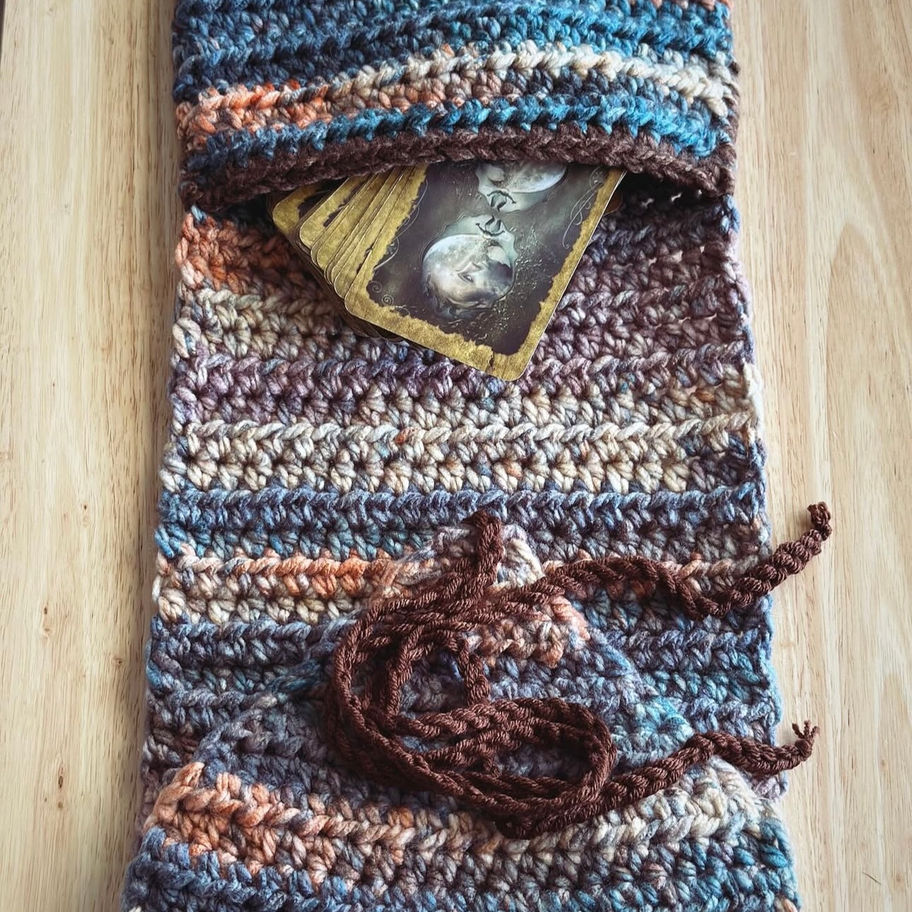 Keep your tarot, oracle, or affirmation cards safe and sound in the pocket of this tarot mat. Fully unwrapped, it's enough space for a 3-5 card spread, depending on the size of your cards. The pocket is also the right size to hold a small journal or standard ereader (shown with a Kindle paperwhite)